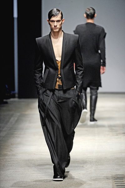 คอลเลคชั่นเสื้อผ้าจาก SONGZIO 2011 MEN โทนสีทั้งหมดเป็นสี เทา-ดำ เช่นเดิม ด้วยรูปทรงต่างๆที่ดูแปลกใหม่สำหรับเสื้อผ้าของผู้ชายทำให้เป็นอีกหนึ่งคอลเลคชั่นที่น่าสนใจ และสิ่งที่เขามักจะเน้นในหลายๆคอลเลคชั่นคือ สิ่งที่แสดงถึงความเป็น “ชาย” ในฟอร์มของเสื้อผ้า